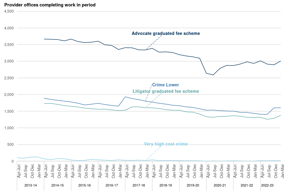 Meanwhile, the number of providers contracted to deliver criminal legal aid has fallen from 1,186 in June 2019 to 1,102 in June 2023. The number of provider offices has also reduced from 1,788 to 1,655 over the same period.