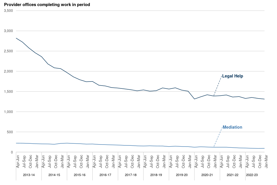 This equates to a reduction of 11%. Similarly, the number of provider offices contracted to deliver legal aid services has also fallen over this period, from 3,643 in June 2019 to 3,218 in June 2023, a reduction of 12%. Of these providers, the number contracted to deliver civil legal aid has fallen from 1,551 in June 2019 to 1,274 in June 2023. Likewise, the number of provider offices contracted to deliver civil legal aid has fallen from 2,521 in June 2019 to 2,053 in June 2023.