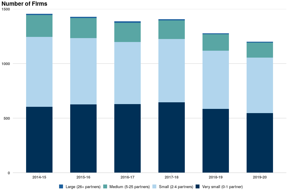 Number of solicitor firms reduced by 18% from 1,455 in 2014-15 to 1,199 in 2019-20. For more detailed breakdowns and information on criminal legal aid firms see the interactive dashboard