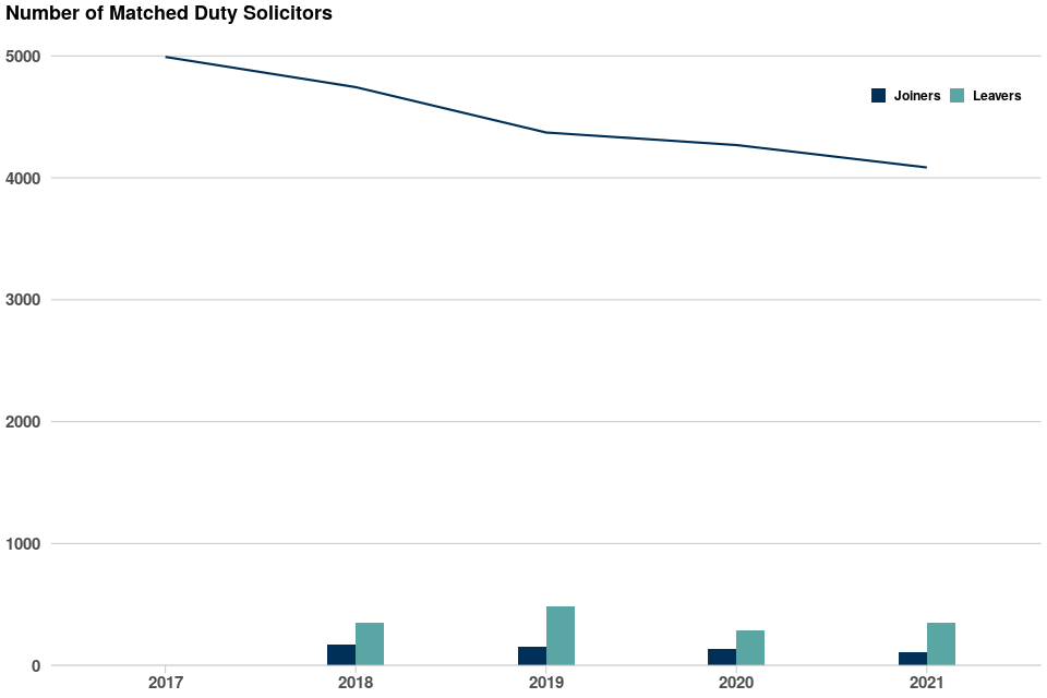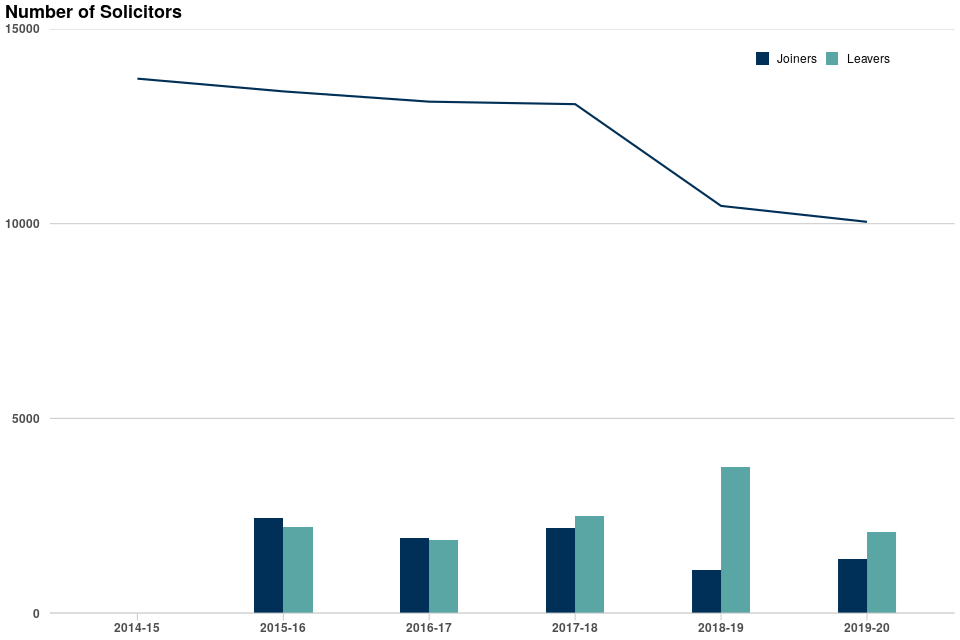 Overall decline of 27% in the number of criminal legal aid solicitors, from 13,724 (2014-15) to 10,047 (2019-20) For more detailed breakdowns and information on criminal legal aid solicitor firms see the interactive dashboard