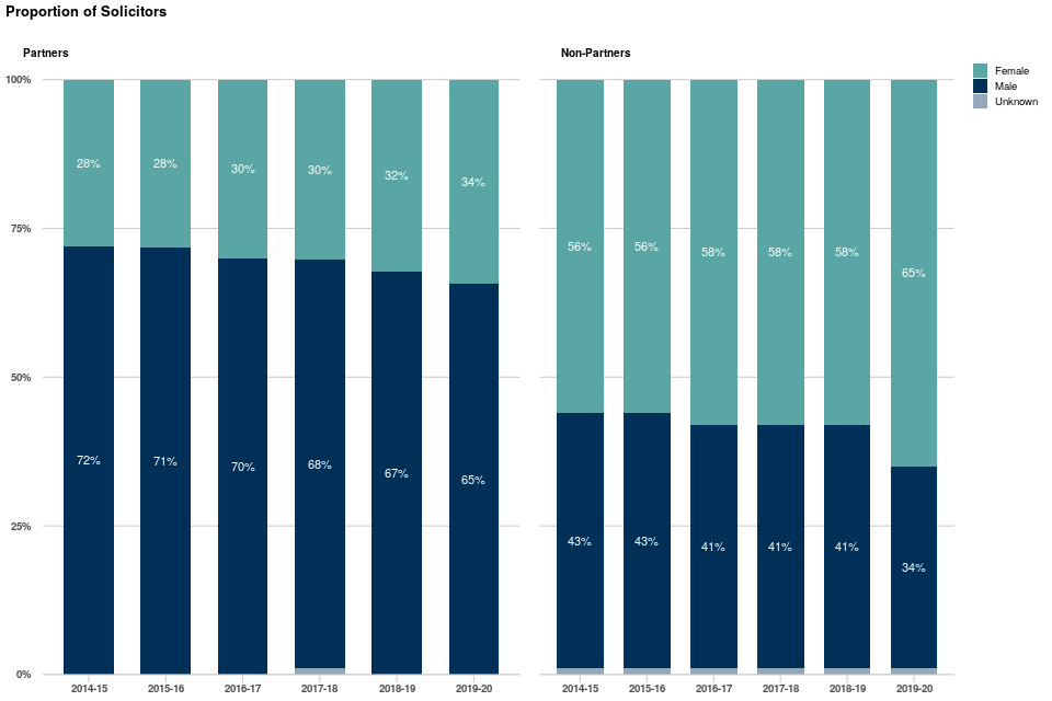 In 2018-19, 32% (3,372) of solicitors registered as partners in criminal legal aid firms. This marked the lowest point in a declining trend from 34% (4,645) in 2014-15. However, there was an improvement in 2019-20, with the proportion of partners rising to 41% (4,162). Among these partners, 34% (1,430) were females, which showed a marked increase from 28% (1,295) in 2014-15, which yielded a consequential steady decline in the proportion of male partners during the same period. Furthermore, in 2019-20, females accounted for approximately two-thirds of all non-partner criminal legal aid firm solicitors.
