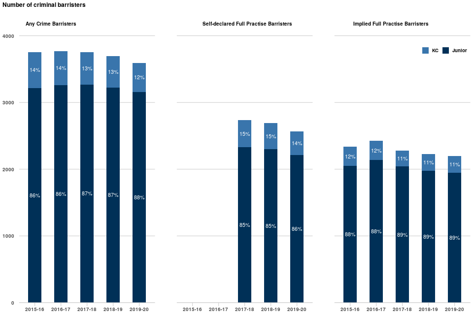 This section examines the characteristics of publicly-funded self-employed criminal barristers in England and Wales, acquired by matching of barristers’ public billing data, as held by the Legal Aid Agency and Crown Prosecution Service, with their corresponding characteristic information held by the Bar Council and Bar Standards Board. For this purpose, barristers are classified into three distinct groups: * the Any Crime group: comprised of barristers who received any criminal fee income in the year being considered. * the Self-declared Full Practice group: a subset of the ‘Any Crime’ group, indicating barristers must have self-declared to the Bar Council that at least 80% of their gross fee income in the respective year came from criminal work, this group is the main focus of this analysis. * the Implied Full Practice group: subset of the ‘Any Crime’ group, with the added condition that each barrister’s fee income from public criminal work must be equal to at least 80% of the lower bound of their total self-reported gross fee income band, which is reported to the BC each financial year.
