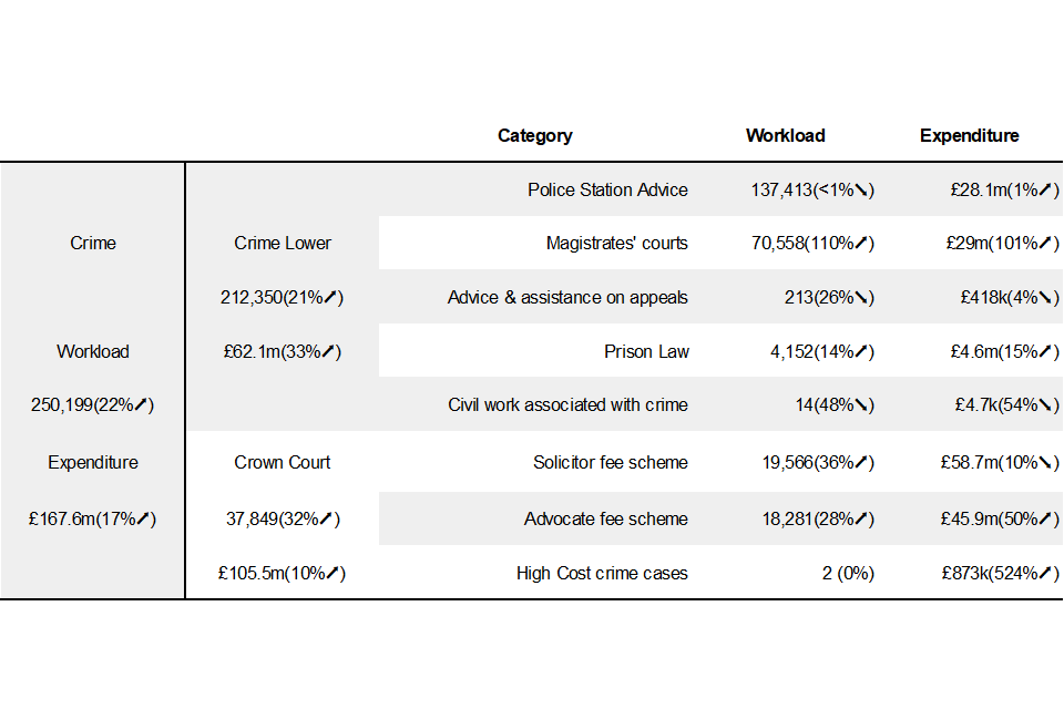 | Overall Crown Court expenditure increased this quarter; up by 10% compared with the same period of the previous year. | ⬈ | This is driven by rising receipts in the Crown Courts with overall criminal legal aid workload rising 22% over the same period. | ||