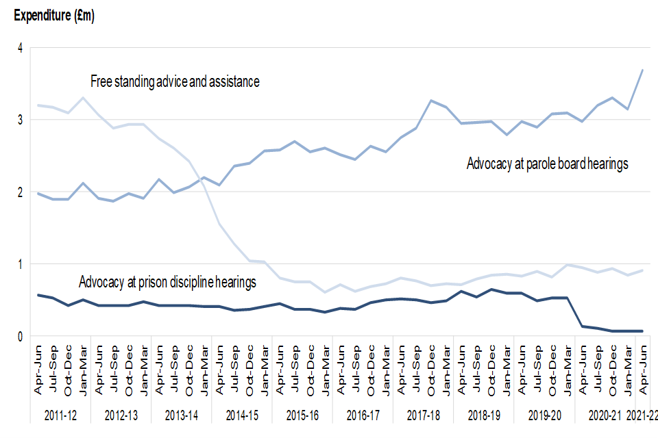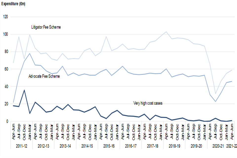 Criminal legal aid expenditure increased compared to the same quarter last year in schemes that support the court system, including the magistrates’ and Crown Court. The incoming workload for representation at the courts has almost returned to levels seen in the period pre-covid. Complex trial cases ongoing at the Crown Court are not completing at the same rate as pre-covid due to social distancing measures, and reduced capacity in the courts is impacting upon closed claim expenditure.