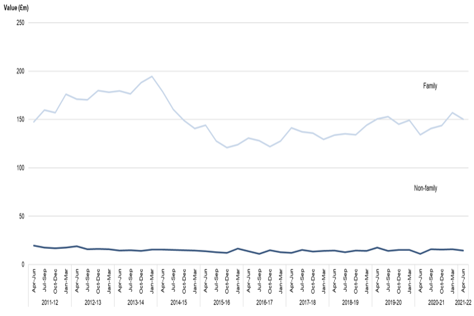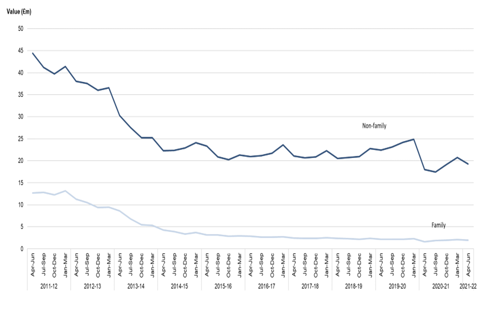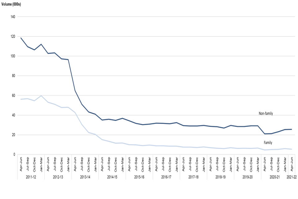 In April to June 2021 family legal help starts (covered in table 5.1) increased by 11% compared to the same quarter last year. Completed claims (covered in table 5.2) also increased by 19% and expenditure (covered in table 5.3) increased by 19%. However, compared to the same period of 2019 (pre-covid), family legal help starts are down by 13%, completed claims are down by 12% and expenditure has fallen by 10%. There was a steep decline immediately following the implementation of LASPO Act in April 2013, with a more gradual decline over the last 2 to 3 years.