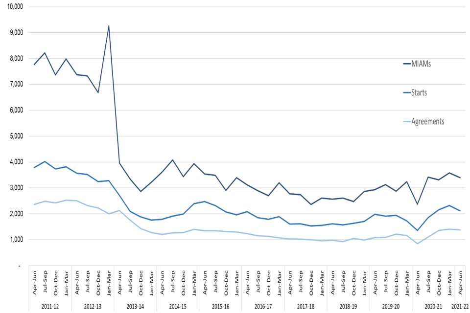 Family mediation involves an independent and impartial professionally accredited mediator discussing problems with a divorcing or separating couple in an attempt to reach agreement without using the courts. A Mediation Information and Assessment Meeting (MIAMs) is an initial meeting between one or both parties and a mediator to see if family mediation could be used to resolve the issue. MIAMs (covered in table 7.1) increased by 43% in the last quarter compared to the previous year and currently stand at over a third of pre-LASPO levels. Family mediation starts (covered along with outcomes in table 7.2) increased by 55% and total outcomes increased by 60%, of which 62% were successful agreements, and are now sitting at around two thirds of pre-LASPO levels.