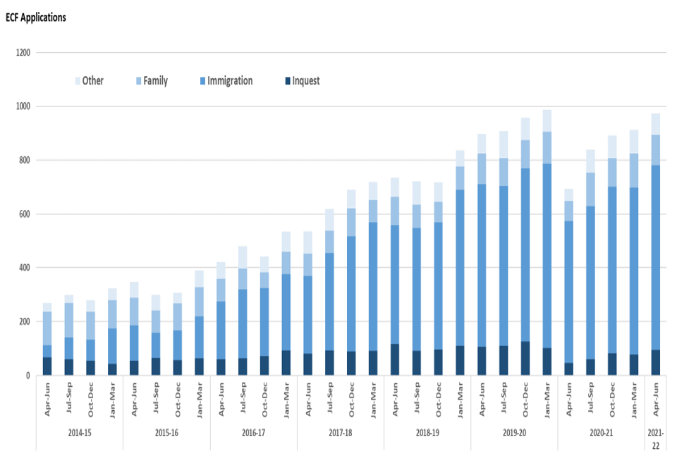 Among the ECF applications received between April and June 2021, immigration (71%), inquest (10%), and family (11%) remained the most requested categories of law. The increase in ECF applications over the last two years is driven by an increase in immigration applications. A breakdown of ECF applications and grants by category of law is provided in table 8.2.