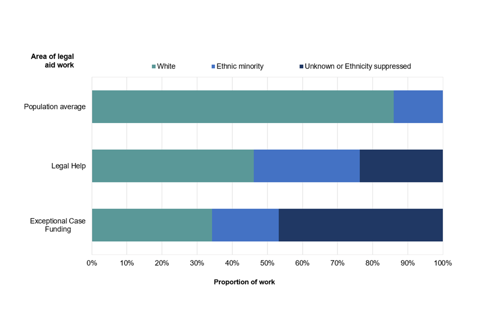 It is difficult to draw firm conclusions from some of the ethnicity data because of the high proportion for which ethnicity is unknown in most areas. Nevertheless, the proportion of legal help and ECF clients reporting as Black/Asian/Minority Ethnic is much larger than in the general population (Figure 21). This may reflect the fact that controlled legal representation (CLR) for immigration is included within legal help and the majority of ECF grants are for immigration work.