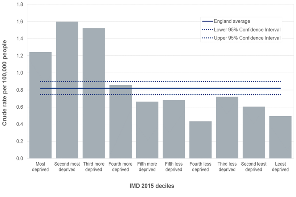 Bar chart showing rate of new diagnoses of confirmed acute hepatitis B per 100,000 population in England, 2016. Data is by County and unitary authority (UA) deprivation deciles in England using Index of Multiple Deprivation (IMD) 2015).