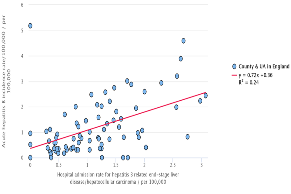 Bringing this indicator in the liver profiles allows users to compare it with other liver disease related indicators. An example of this is shown in Figure 2 where areas with a higher incidence of hepatitis B are shown to also have higher rates of hospital admissions for hepatitis B related end stage liver disease.