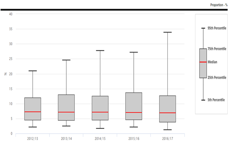 Figure 3: Box plot of the percentage of eligible persons, who entered drug misuse treatment, completing a course of hepatitis B vaccination, England, from financial year 2012 to 2013 up to financial year 2016 to 2017