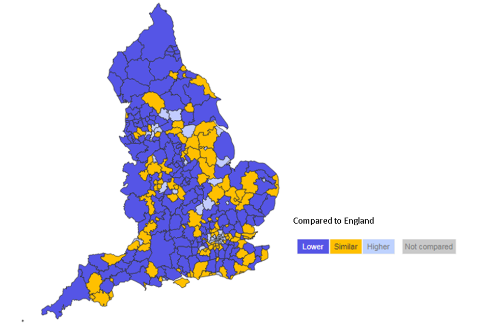 Map of chronic hepatitis C detection directly standardised rate across English countries and unitary authorities compared to England in 2016.