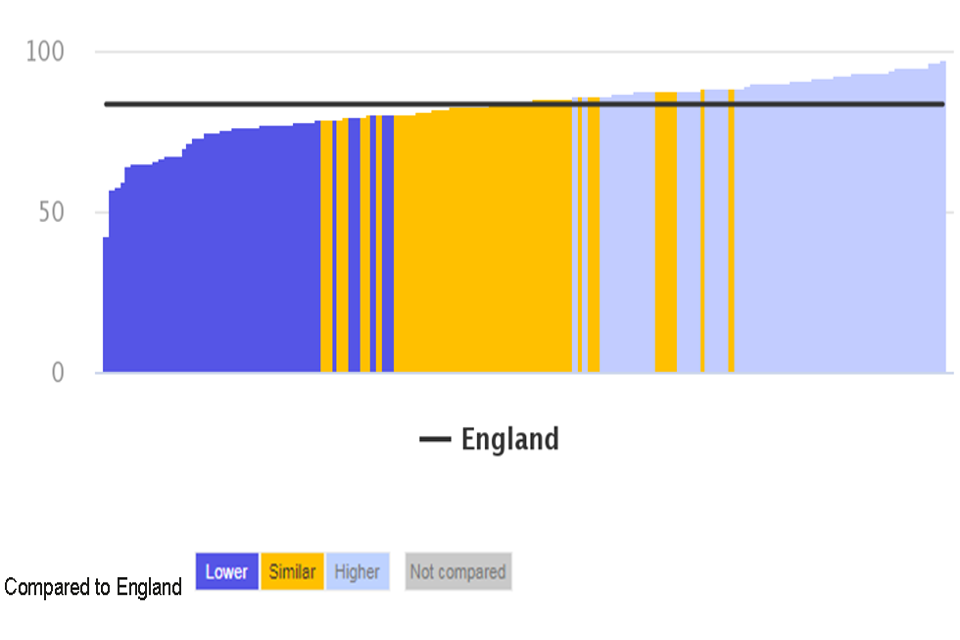 Figure 5: The variation in proportion of people receiving a hepatitis C test across England’s Counties and UAs, financial year 2016 to 2017