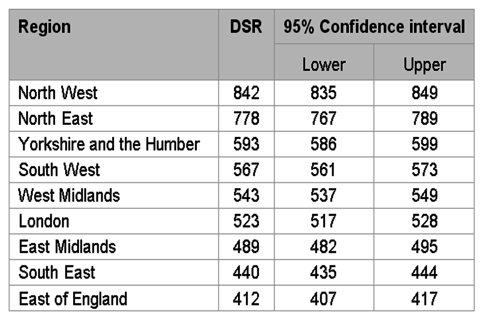 Table of directly standardised rate of hospital admission episodes for alcohol-specific conditions, per 100,000 people of all ages, in 2016 to 2017, by region