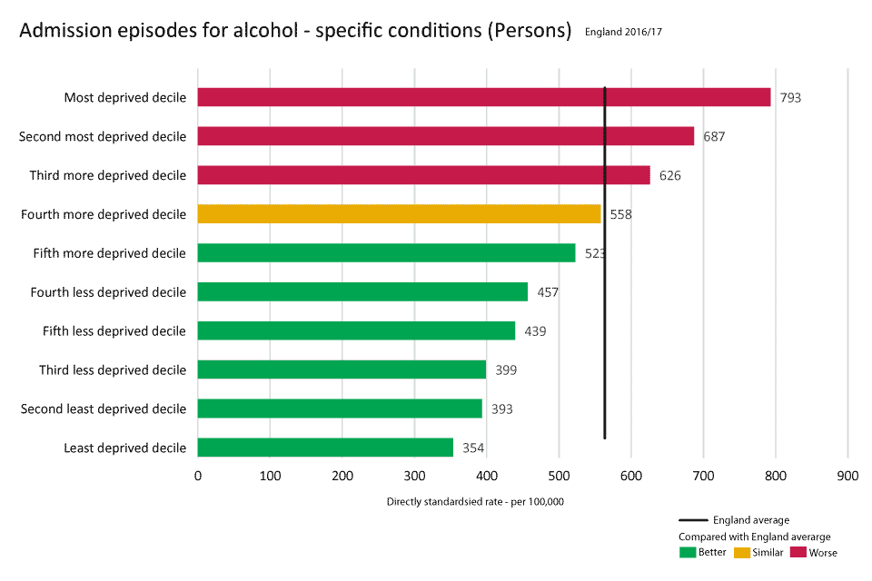 People living in the poorest areas of the county have a much higher (793 per 100,000) admission rate for alcoholic specific conditions than those in more affluent areas (354 per 100,000) (Figure 6).