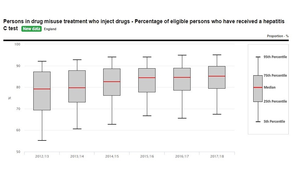 A box plot showing the proportion of eligible persons aged 18 and over in drug misuse treatment who inject drugs and received a hepatitis C test between the financial years ending 2013 and 2018 in England