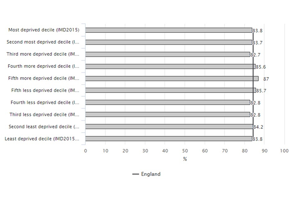 A bar chart showing the percentage of eligible persons aged 18 and over in drug misuse treatment who inject drugs and have received a hepatitis C test between 2015 and 2017 in England, in relation to deprivation decile