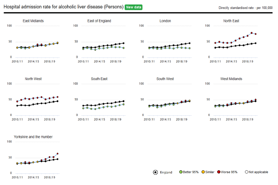at a regional level, overall rates of liver disease admissions to hospital remain highest in the north of England with the North East having the highest rate of 166.8 per 100,000 population in the financial year ending 2021