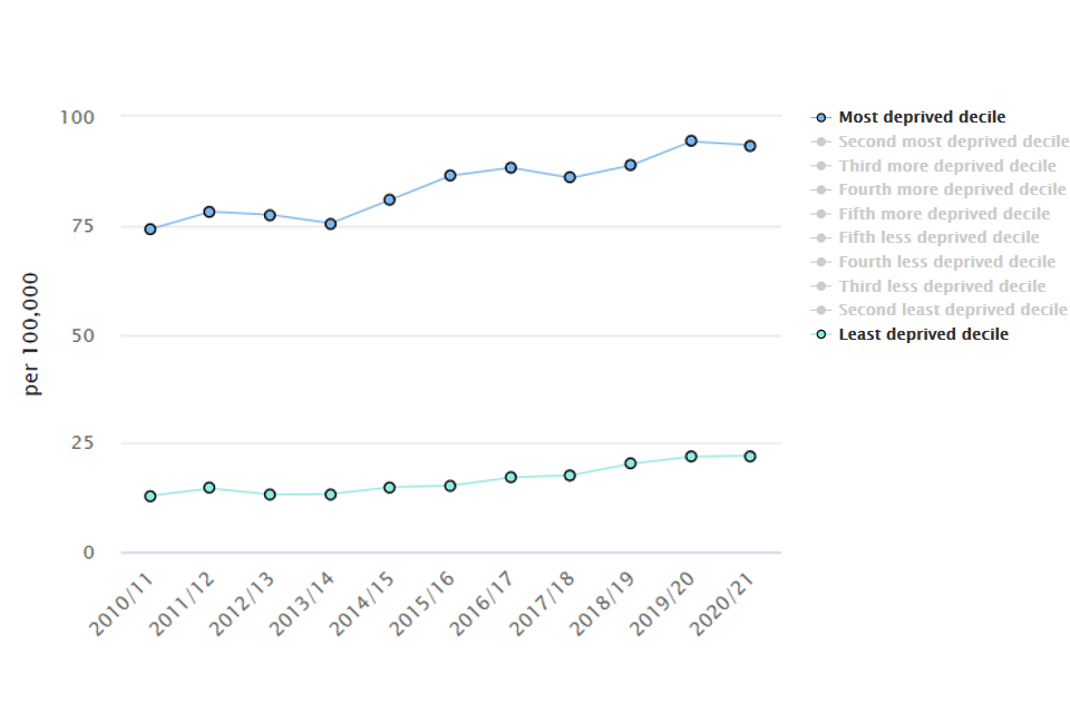 Areas with high levels of deprivation experience higher rates of hospital admission for liver disease. Those in the most deprived lower super output area deprivation decile have a rate (199.3 per 100,000 population) that is 2.3 times higher than that of the least deprived areas (86.0 per 100,000 population). The gap between the deprivation deciles has remained similar over the previous years.