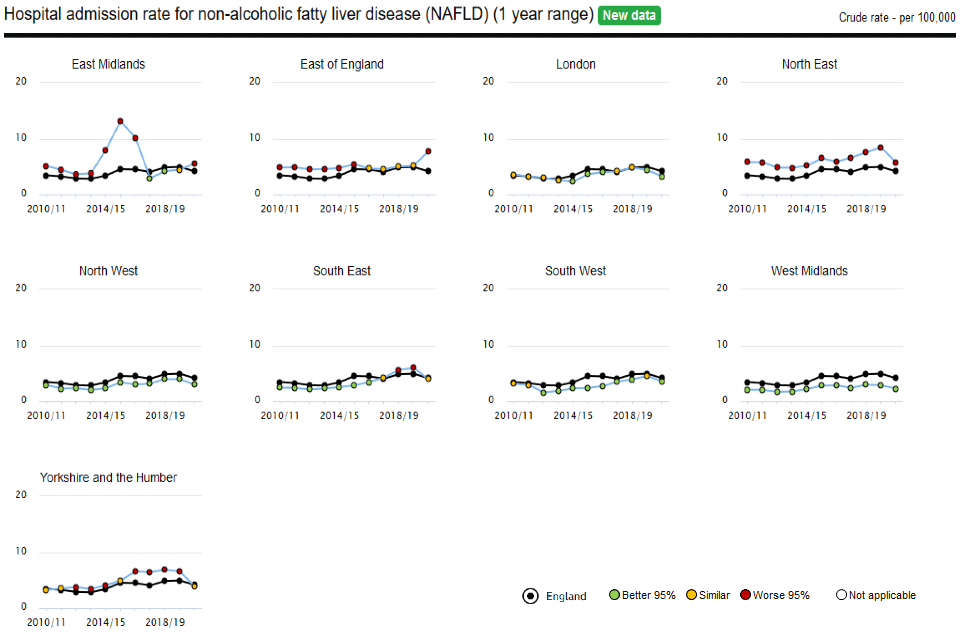 in the financial year ending 2021, the rate of hospital admissions from non-alcoholic fatty liver disease reduced to 3.7 per 100,000 population, a count of 2,085, which is significantly lower than the rate in previous year (4.9 per 100,000 population, a count of 2,777)