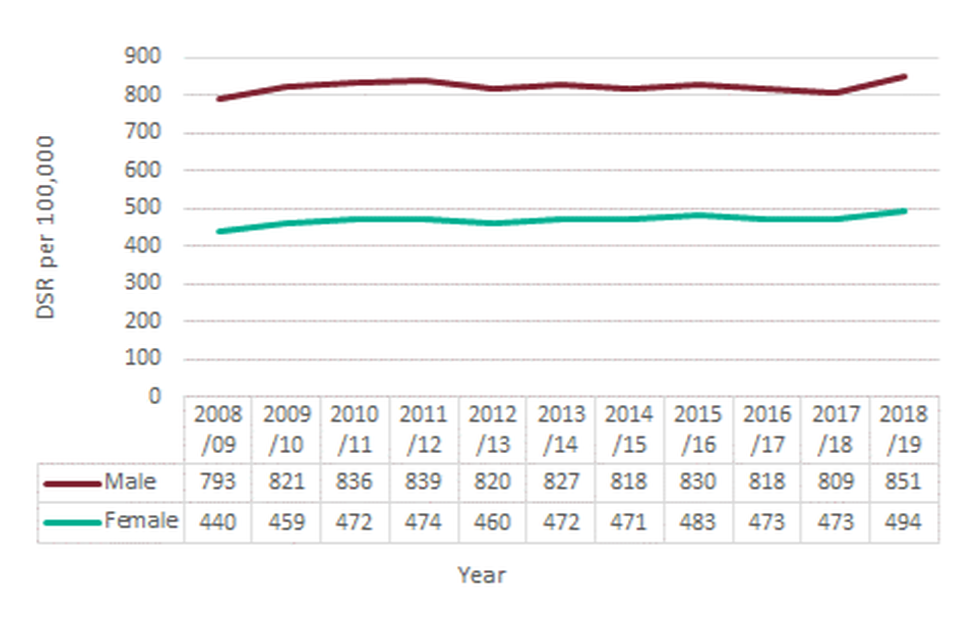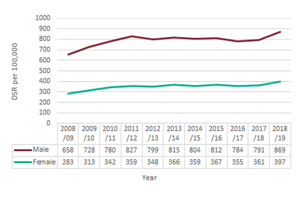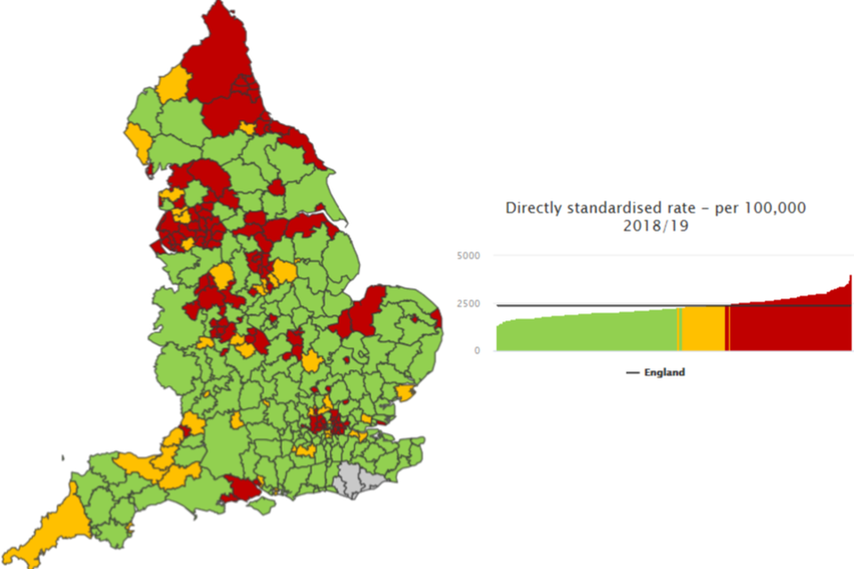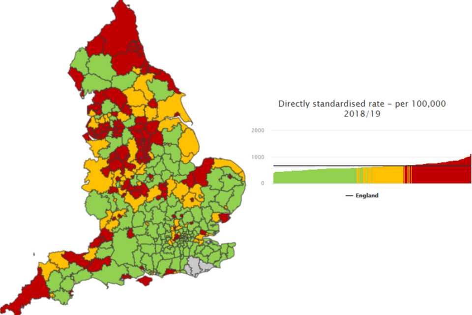 The rate of hospital admissions on the Narrow definition was higher in the most deprived 10% of local authorities (775 per 100,000) than the least deprived 10% (510 per 100,000).