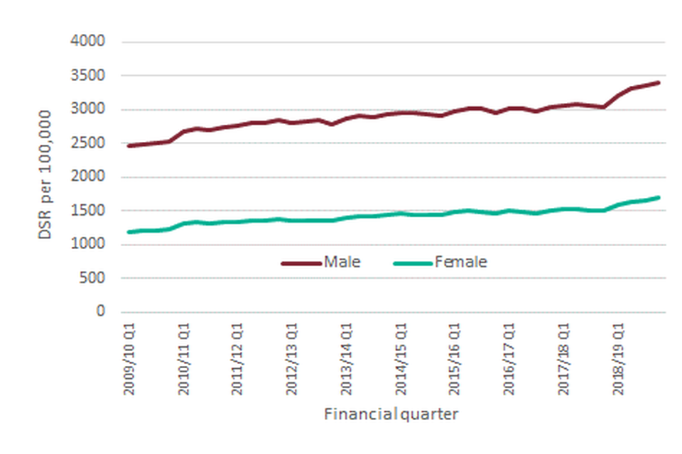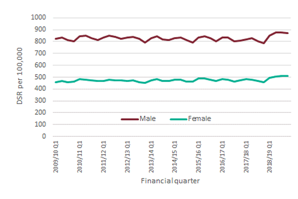 In quarter 4 2018 to 2019 (January to March 2019) there were 88,130 hospital admissions for alcohol-related conditions on the Narrow measure. This equates to an admission rate of 679 (per 100,000), again higher than the comparative annual rate for 2018 to 2019 (664 per 100,000). The last 3 quarters of 2018 to 2019 demonstrate the highest rates in the quarterly trend since the start of LAPE.