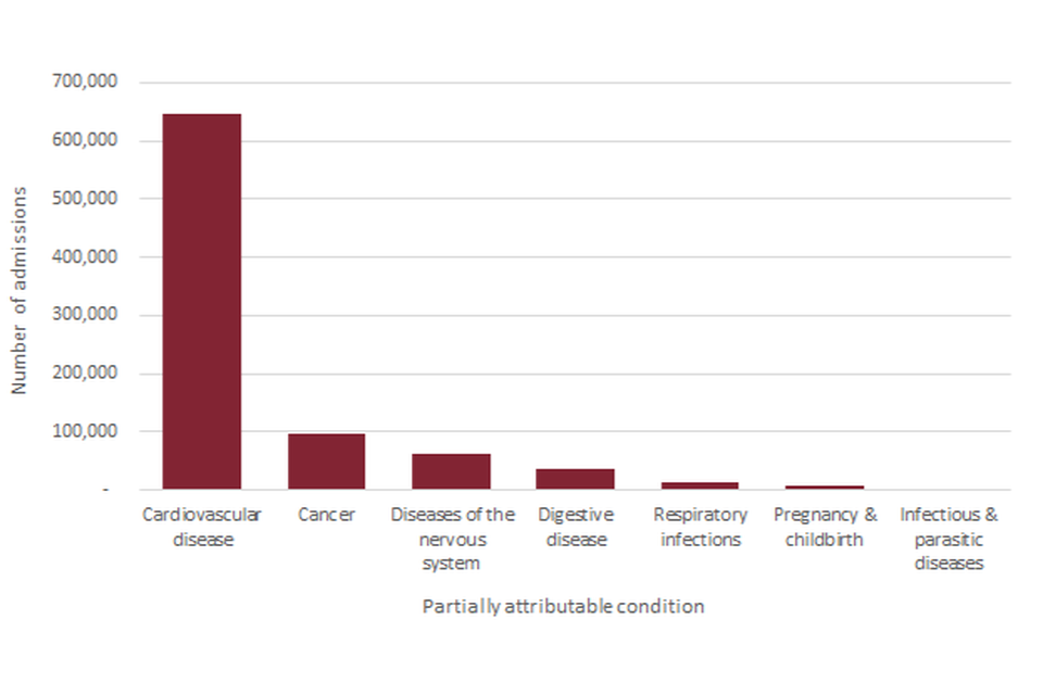 As shown in Figure 10, cardiovascular disease is the most common reason for admission. In 2018 to 2019, there were an estimated 645,070 alcohol-related hospital admissions from cardiovascular disease.