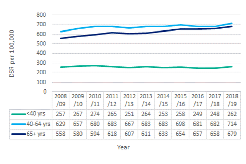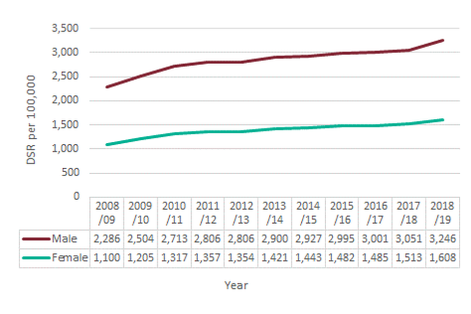 In 2018 to 2019, there were 336,314 alcohol-specific hospital admissions. The rate of admissions increased from 570 (per 100,000) in 2017 to 2018 to 626 (per 100,000) in 2018 to 2019.