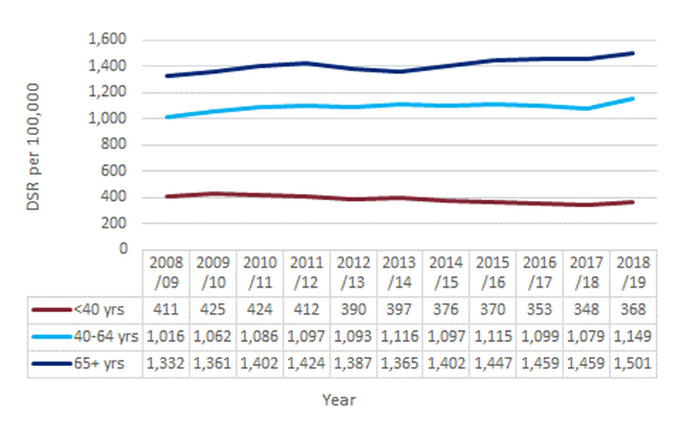 The rate of hospital admissions for alcohol-related conditions on the Narrow measure was highest in the over 65s age group.