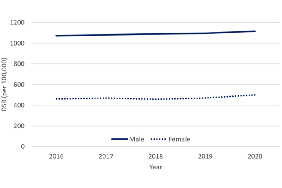 Figure 1: age standardised potential years of life lost due to alcohol-related conditions rates by sex, 2016 to 2020, England