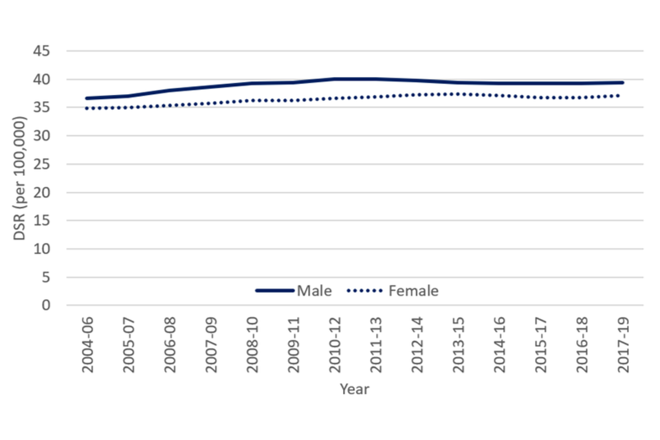 Figure 3: Age standardised alcohol-related cancer incidence by sex, 2004 to 2006 to 2017 to 2019, England
