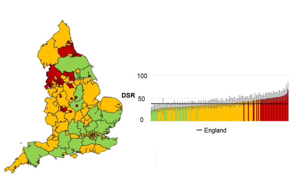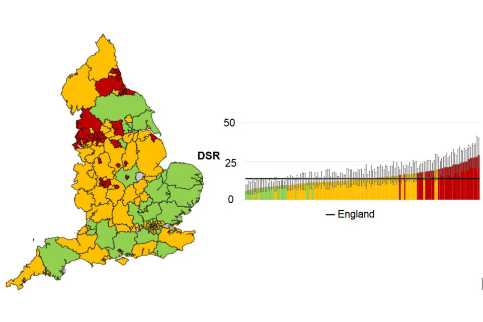 The mortality rate was highest in the North East region (49.0 per 100,000) and lowest in the London region (32.2). The mortality rate at upper-tier local authority level varied from 68.9 in Blackpool to 21.5 in Richmond upon Thames.