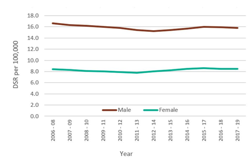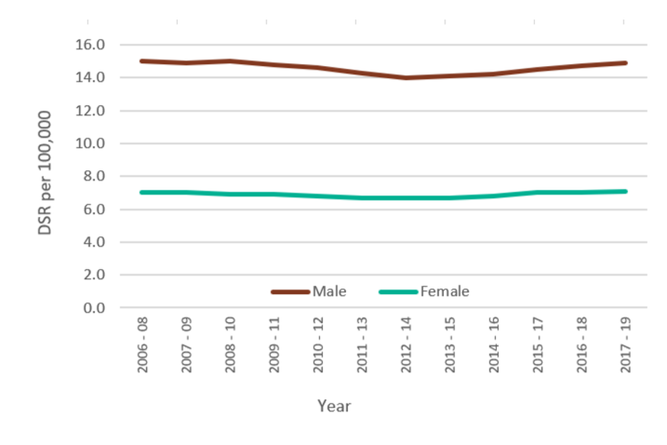The female rate (8.5 per 100,000) and the male rate (15.8 per 100,000) both showed little change in the latest period. Again, the number of deaths from chronic liver disease between 2017 and 2019 for men (12,120) was almost double the number for women (6,980).