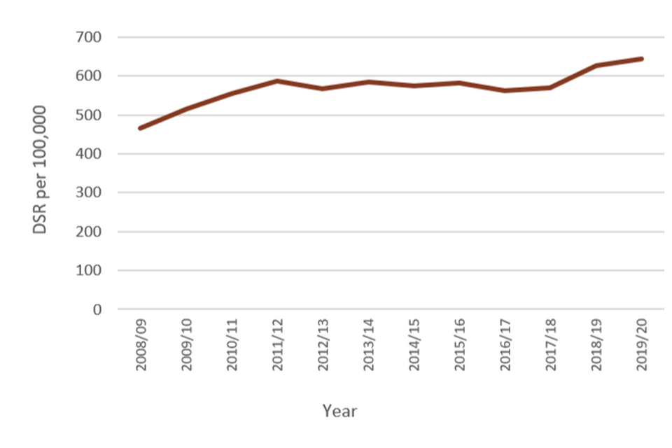 The rate of chronic liver disease mortality in the most deprived areas (17.2 per 100,000) was almost double the rate in the least deprived (8.7 per 100,000) in the most recent time period.