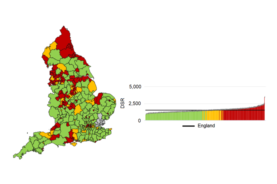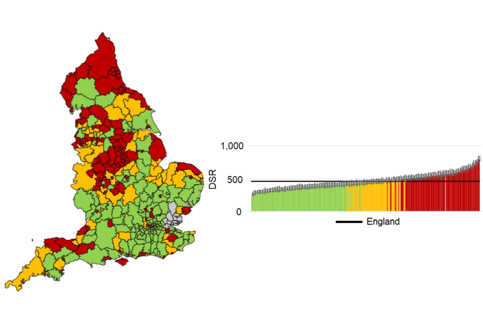 Figure 2 also shows the variation in alcohol-specific admission rate across district and unitary authorities in England, ranging from 203 (per 100,000) in Eden to 2,276 (per 100,000) in Southampton.