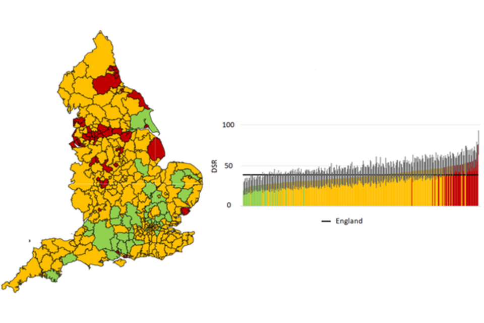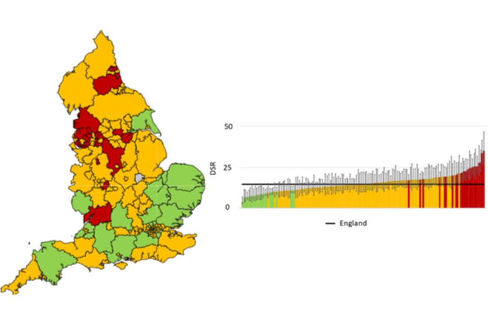 The mortality rate was highest in the North East region (50.4 per 100,000 population) and lowest in the East of England region (32.3 per 100,000 population). The mortality rate at lower tier local authority level varied from 77.5 in Blackpool to 20.2 (per 100,000 population) in East Hampshire.