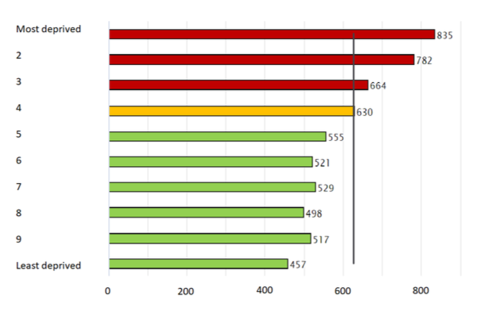 Figure 4: alcohol-specific admission rate, lower tier local authority deprivation deciles in England, 2021 to 2022