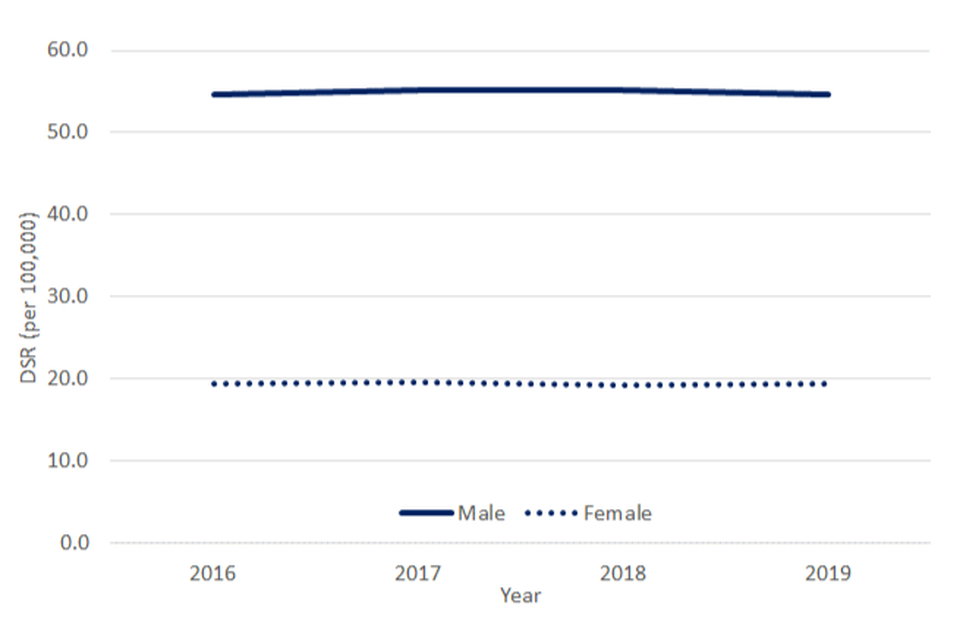 There were 19,190 alcohol-related deaths in England in 2019. This equates to a rate of 35.7 (per 100,000) and the trend shows no significant change since 2016. The female rate in 2019 was 19.4 (per 100,000) while the male rate was 54.7 (per 100,000). Consequently, the number of alcohol-related deaths in 2019 for men (13,705) was more than double the figure for women (5,485).