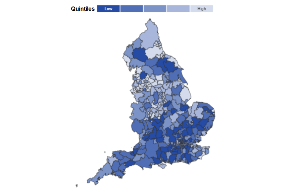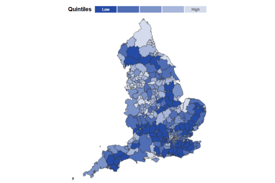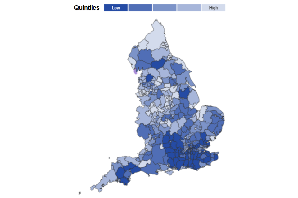 Figure 2 shows the variation in alcohol-related mortality rates across lower tier local authorities in England, ranging from 19.7 (per 100,000) in South Cambridgeshire to 65.4 (per 100,000) in Blackpool.