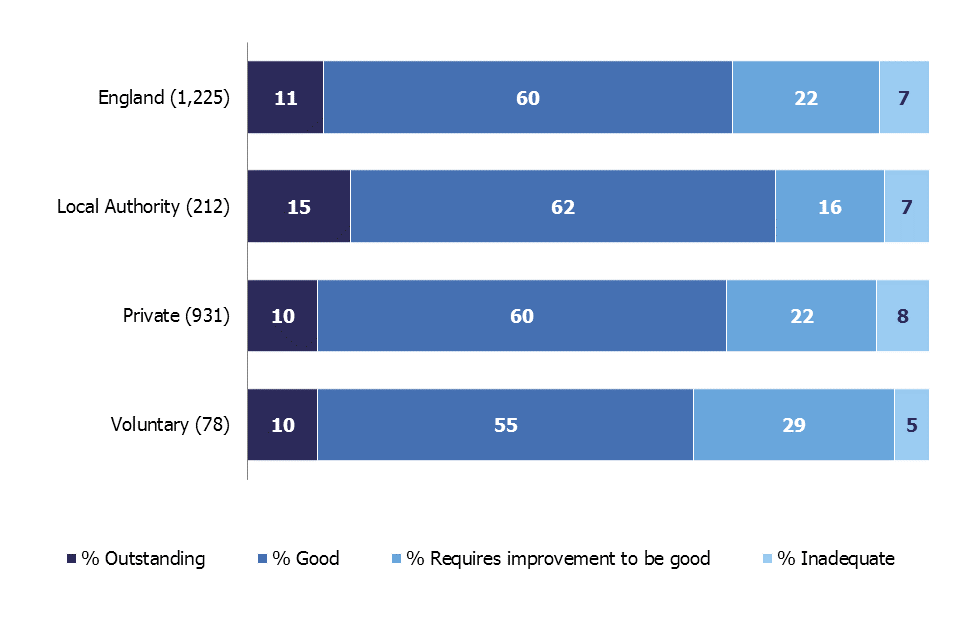 Compared to this period in the last year, the inspection judgements for local authority and private children’s homes have remained broadly the same. The proportion of voluntary children’s homes judged good or outstanding has declined by 11 percentage points, from 76% to 65%.