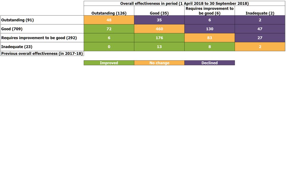 This looks at all providers active on 30 September 2018, and what their most recent inspection judgement was at this date. For all but 3 providers (who received an overall effectiveness judgement at their most recent monitoring inspection) this was their most recent full inspection. Providers inspected prior to 1 April 2018, but not since, will have their previous judgement included.