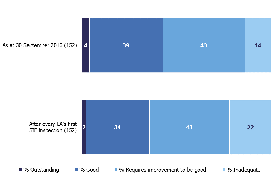 As at 30 September 2018, 43% of LAs were judged to be good or outstanding, an increase from 36% after every LA’s first SIF inspection.
