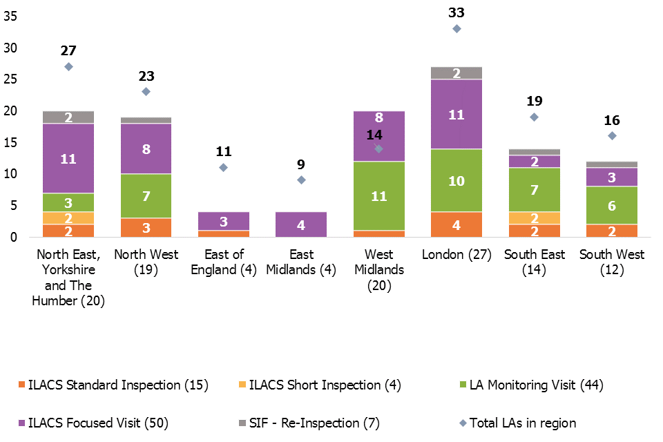 Note that some LAs will have received multiple visits and/or inspections in the period, so the total number of visits/inspections may not reflect the total number of LAs in the region.
