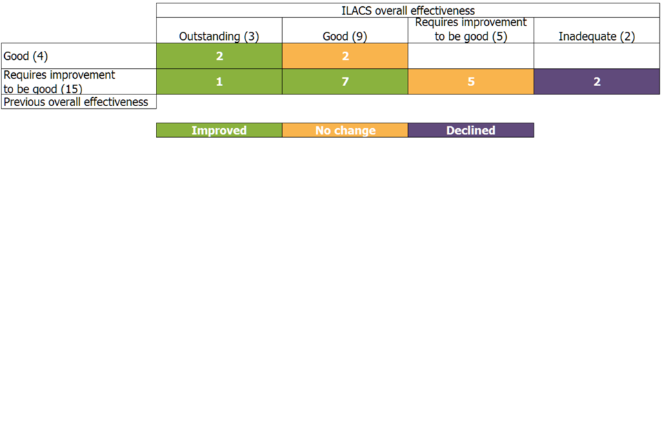 Table 1: Change in overall effectiveness from single inspection framework inspection to Inspections of Local Authority Children’s Services