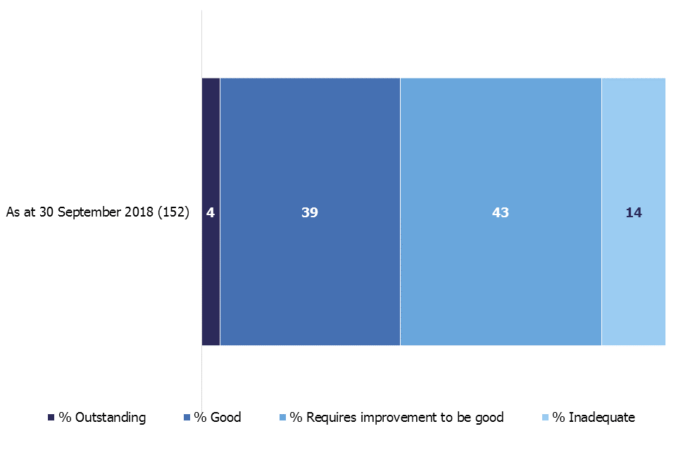 This figure shows the proportion of local authorities judged outstanding, good, requires improvement to be good, and inadequate as at 30 September 2018.