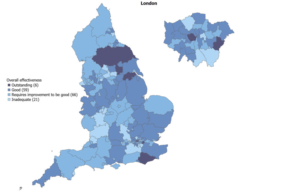This map shows how inspection judgements are spread across every local authority in the country.