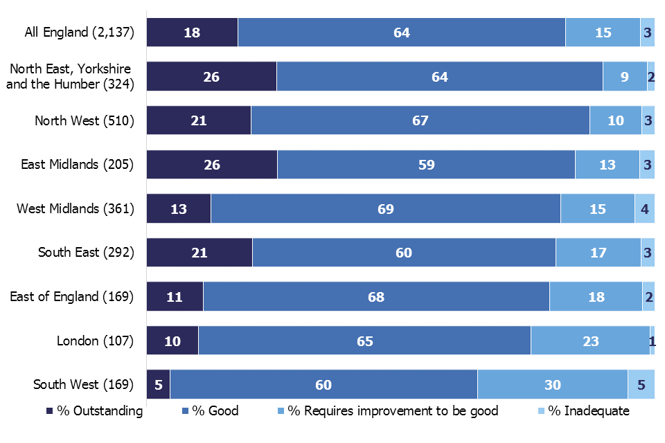Three regions saw small increases in the percentage of all children’s homes judged good or outstanding since the same date last year, while 3 regions saw small decreases. The percentage of homes judged good or outstanding in the North West and North East, Yorkshire and the Humber remained the same as last year.
