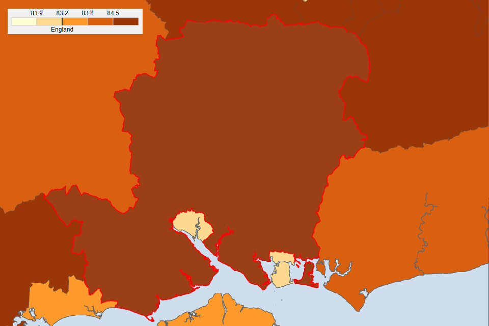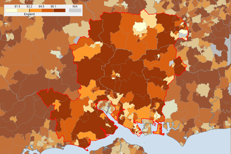 Although an upper tier local authority has a high life expectancy as a whole, there may be pockets of areas with low life expectancy, which can only be detected at a small area level. For example, the overall life expectancy for females in Hampshire is 84.5 years, however for wards within this area it ranges from 78.4 to 93.7 years (Figure 2).