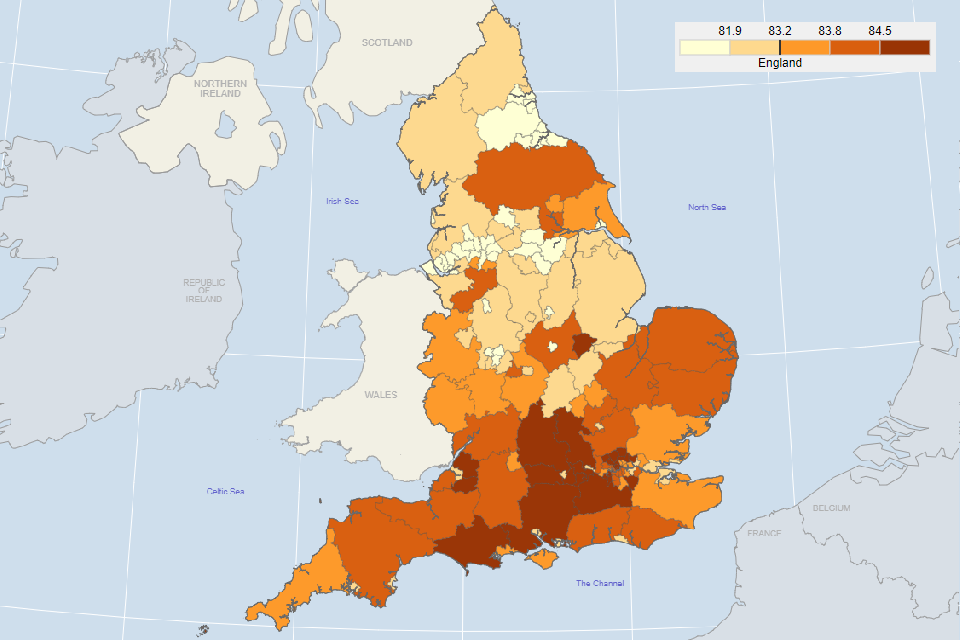 The life expectancy at birth indicators for males and females have been updated to the period 2016 to 2020. Figure 1 shows that at upper tier local authority level, life expectancy at birth for females is higher in the south of England compared to the north. However, at ward level the picture is much more complex with a large amount of variation across neighbouring areas.