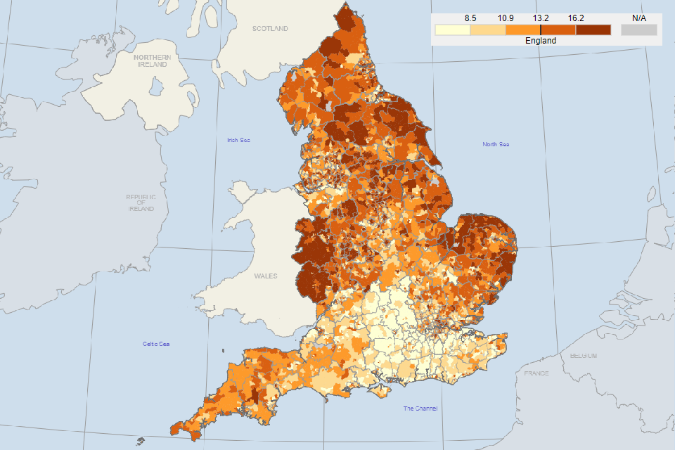 In 2020, 13.2% of households in England were classified as being in fuel poverty. At ward level, a higher percentage of households in the north of England were in fuel poverty compared to the south (Figure 3).